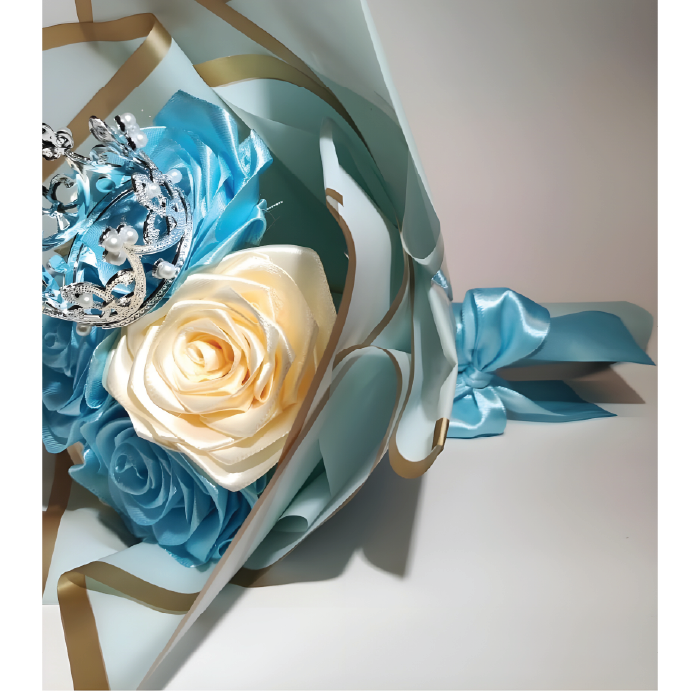 This stunning handmade bouquet features delicate blue and beige ribbon roses, carefully arranged to create a timeless floral display. Each bouquet is finished with a satin ribbon bow and wrapped in elegant blue paper with gold trim.