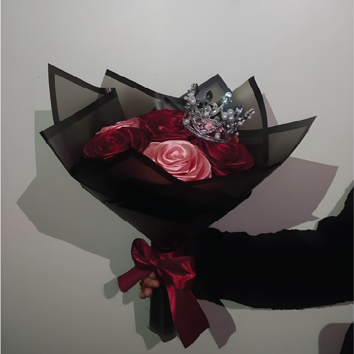 This stunning bouquet features delicate red and pink ribbon roses, carefully crafted to create a timeless floral arrangement. Can be adorned with a silver crown accent, complete with pearl details, or a tiara or gems, this bouquet exudes elegance and charm. Wrapped in black paper with even black trim and finished with a satin ribbon bow, it’s the perfect gift for special occasions or a beautiful addition to any space.
